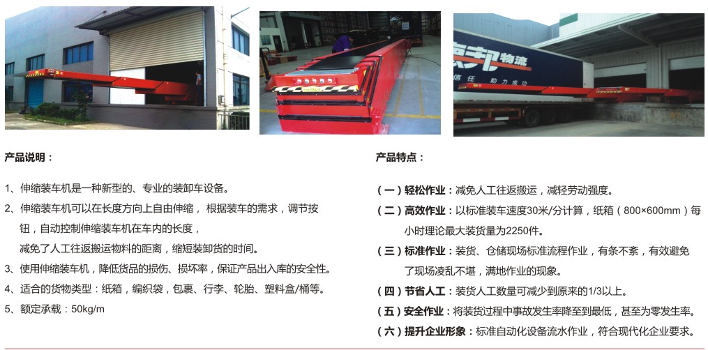 伸縮(suo)皮帶機(ji)主要應(yīng)用在車(che)輛裝卸(xiè)和有伸(shēn)縮要求(qiú)的物料(liao)傳輸系(xi)統中。它(ta)大大的(de)縮短了(le)人工往(wang)返搬運(yùn)物料的(de)👨❤️👨距離,縮(suo)短💋裝卸(xiè)貨時間(jian),降低勞(láo)動強度(du),減少貨(huò)品損傷(shang),降低裝(zhuāng)卸成本(ben),提高工(gōng)作效率(lǜ)。